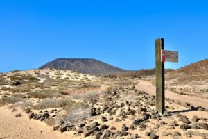 - Cima de la montaña La Caldera: si sigues el sendero con escalones que facilitan el ascenso a La Caldera, podrás disfrutar de unas vistas espectaculares de la Isla de Lobos, además de las costas de Lanzarote y Fuerteventura en el horizonte.